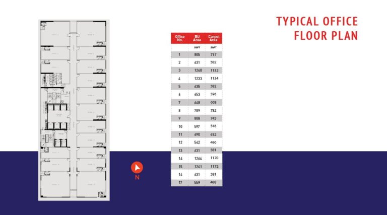 Office Units: 17 offices ranging from 542 to 1261 sq. ft. built-up area.